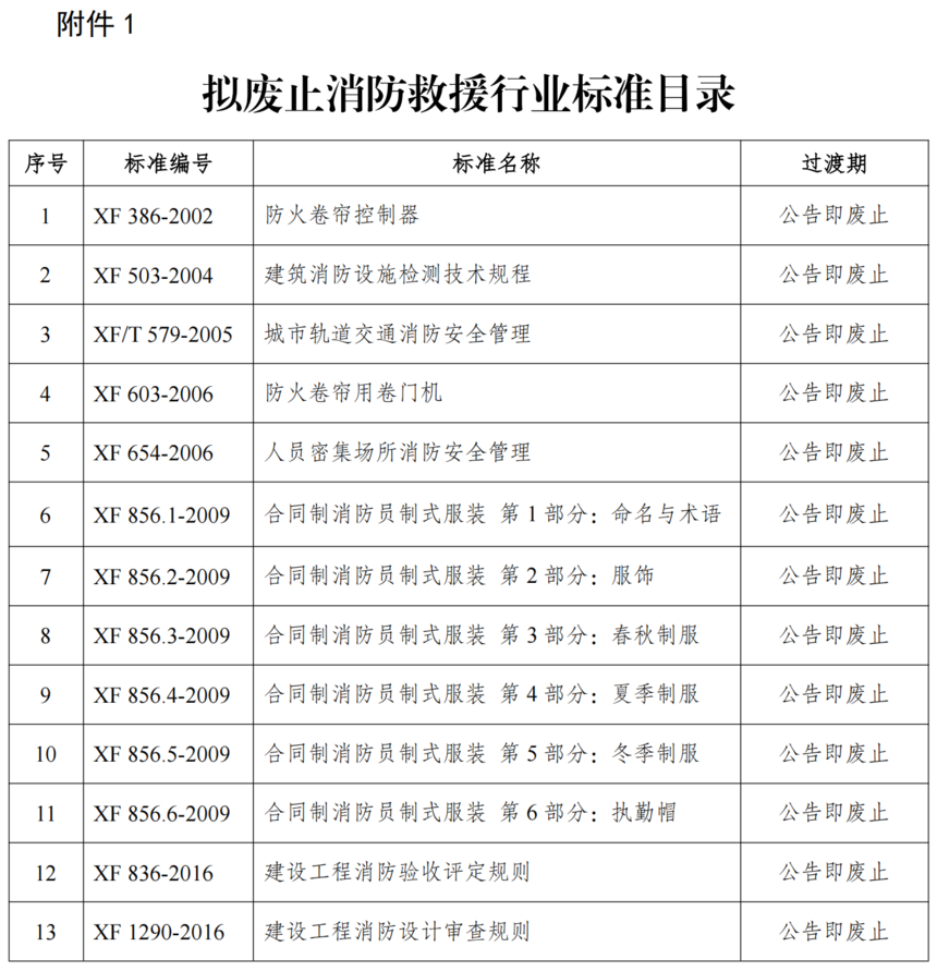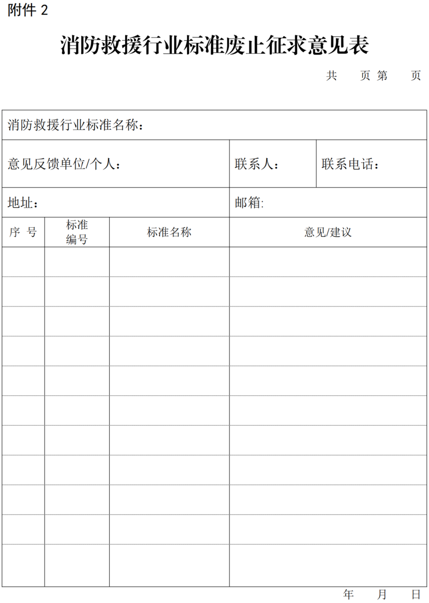 根据《中华人民共和国标准化法》《行业标准管理办法》的有关规定,国家消防救援局对已实施5年以上的消防救援行业标准开展了复审。依据复审结论,国家消防救援局拟废止《防火卷帘控制器》(XF 386-2002)等13项消防救援行业标准(见附件1),现向社会公开征求意见,征求意见截止时间为2026年3月26日。在征求意见期间,任何单位或个人如有异议,请填写征求意见表(见附件2),并将征求意见表电子扫描件发送至电子邮箱sactc113@sina.com。以单位名义提出的请加盖公章并附联系方式,以个人名义提出的由本人签字并附身份证复印件及联系方式。截止时间过后不再受理。联系电话:010-83932735。
