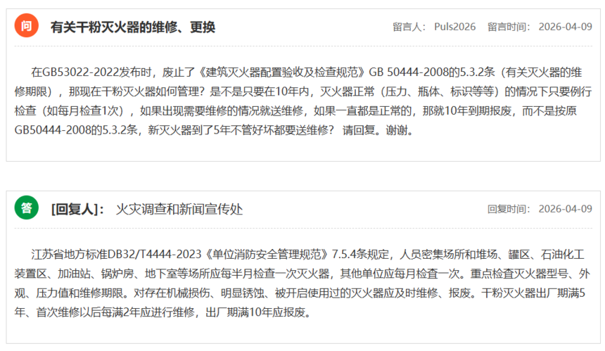 在GB53022-2022发布时,废止了《建筑灭火器配置验收及检查规范》GB 50444-2008的5.3.2条(有关灭火器的维修期限),那现在干粉灭火器如何管理?是不是只要在10年内,灭火器正常(压力、瓶体、标识等等)的情况下只要例行检查(如每月检查1次),如果出现需要维修的情况就送维修,如果一直都是正常的,那就10年到期报废,而不是按原GB50444-2008的5.3.2条,新灭火器到了5年不管好坏都要送维修?请回复。谢谢。